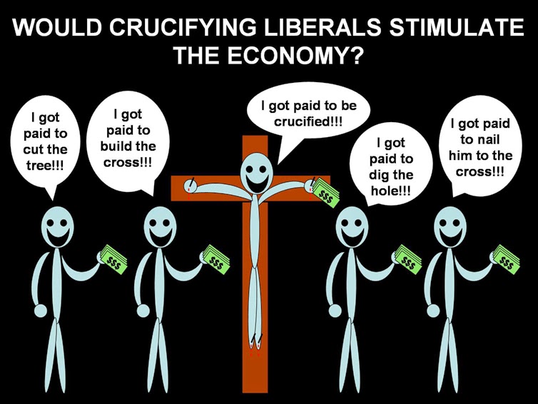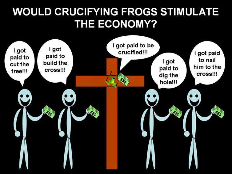 But...but...we'd have to employ somebody to nail you to a cross. That's a good thing right? And, before you could be nailed to a cross, we'd have to have a cross in the first place. This means that we'd need to hire somebody to cut down a tree, and then we'd have to hire somebody else to build the cross. Plus...I think we'd need a hole to stick the cross into...so we'd also have to hire somebody to dig the hole. How many people is that? At least four? This is quite a labor intensive endeavor! Nailing you to a cross would, therefore, stimulate the economy.