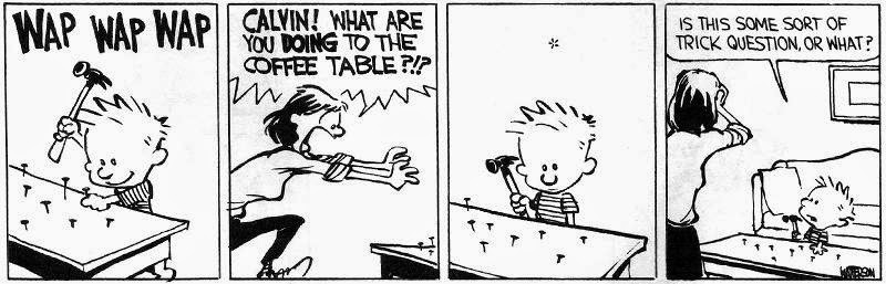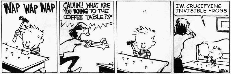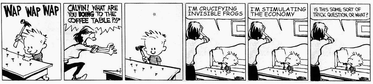Calvin and Hobbes is second only to Charlie Brown and Snoopy. I read both of them religiously when I was a kid. So of course the above strip popped into my mind when I was writing my reply to JohnfrmClevelan. There Calvin is...*WAP WAP WAP*... pounding nails into his mother's coffee table. His mother freaks out when she discovers what he's doing. Clearly she's clueless about the immense benefits of liberal economics. Calvin is obviously crucifying invisible frogs...