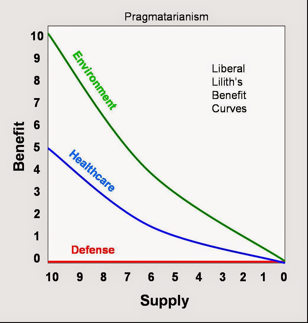 I sure hope the graph/chart is self-explanatory but it probably isn't. Benefit and supply are both on scales from 0 (minimum) to 10 (maximum). If the supply of environmental protection and national healthcare decreases... then so too would the amount of benefit that Lilith derives from them...but not equally so. With defense however, a decrease in supply has no impact on the amount of benefit that Lilith derives from it.