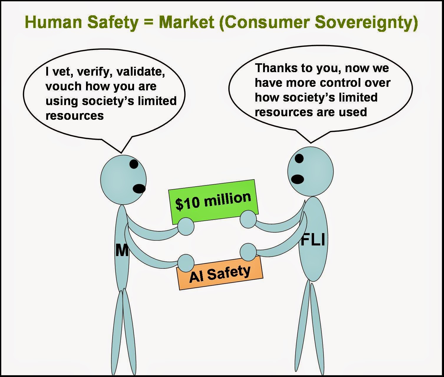 Markets ensure that humans do what we want them to do. The reason for this is because markets operate on the basis of consumer sovereignty. In the private sector Elon Musk is the king of his money. He considered the relevant information, weighed the opportunity costs and and gave $10 million dollars to the FLI.
